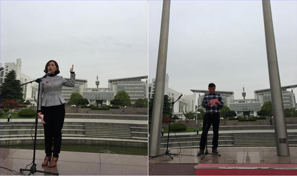 礼毕后,蒋其琴老师发表国旗下讲话,呼唤当代青年大学生“认真学习习近平主席讲话”,坚定好中国特色社会主义理想,把准好人生的航向,在实际生活中养成高尚的品格,落于行动;她强调大家要不忘创新精神,勇于担当责任,在开拓人生道路的过程中,不仅需要督学求实的学习品质,“无学无以广才,无志非以成学”,除了学习外还要多思考、多实践,在实践中把握好发展方向,是为志也;最后,蒋老师期望外院学子坚定民族情怀,作为外语人,可以用别人的语言讲述自己的故事,帮助树立祖国的正面形象。“恰同学少年,风华正茂”,蒋老师以毛主席诗句寄语外院学子,牢记奋进使命,做新时代青年。