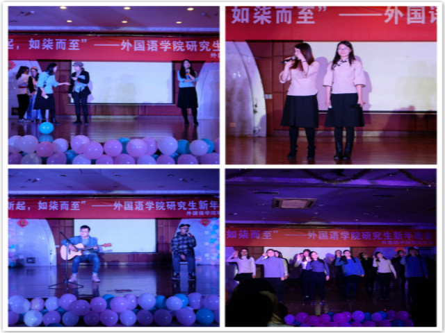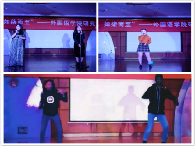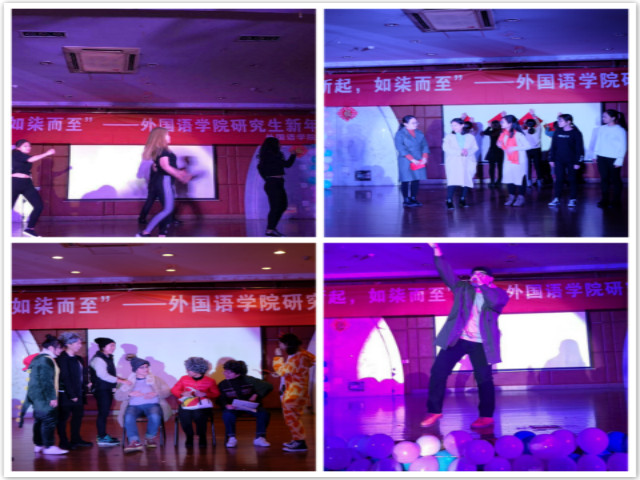 晚会初始,外应比文班和英语语言文学班分别表演小品《笑看风云》和《地铁故事》,演员们的实力演技和浓浓的东北口音让大家连声叫好。“翻硕吴彦祖”吉睿琦同学的独唱Like A G6则又是另一种气氛,让同学们体验了青年一代朝气蓬勃的嘻哈文化。接下来是韩舞表演,音乐节奏感十足,同学们用舞蹈诠释自己对美好生活的向往。节目中途放映了导师们对同学的新年祝福视频,老师们寄语新生,希望他们珍惜三年的研究生生活,不仅要学习知识,也要培养各方面能力。
