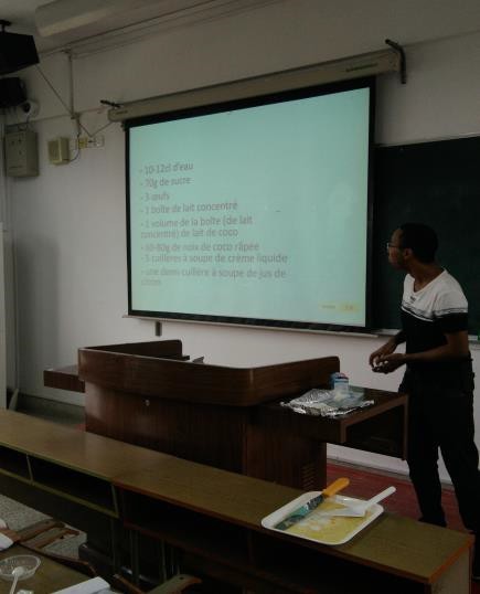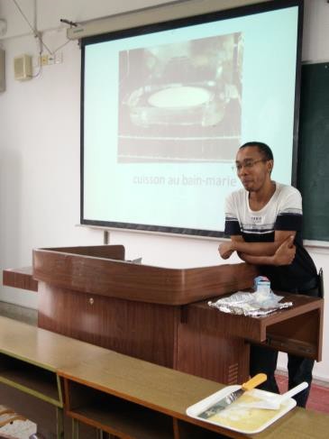 学生就甜品所需准备时间、温度要求、Tiana 对中餐的兴趣以及材料购买地点等提问,Tiana 详细回答并与大家分享了他的美食心得以及美食与文化之间的关系。学生由外教骑自行车去购买食材和工具这一点延伸出来的问题是关于法国公共自行车的问题,外教就此做了说明:法国很多城市因为没有自行车道,且法国人上班地点离住处较远,公共自行车不太流行,虽然公共自行车在法国比在中国开始得更早。