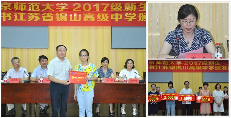 李莉处长宣读南师大本科录取新生名单后,胡敏强书记一一为准大学生们颁发了录取通知书,学院蒋其琴书记宣读了省锡中4名新生奖学金获奖名单并为他们颁发了奖励。