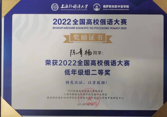 外院俄语专业学生陈青杨获2022年全国高校俄语大赛低年级组二等奖