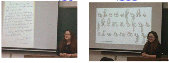 首先,Aude老师展示了一封法国总统马克龙的手写信件,引入花体字书写的主题。她介绍了西文字体的历史演变、大致种类和使用目的,以及法国人的书写习惯,随后为同学们分发了专用的纸笔。老师从简易的小写字母开始,再到难度更大的大写字母,由浅入深,细致讲解了书写格式和笔划顺序。大家早已跃跃欲试,立刻开始按照样字认真练习。等到同学们已经熟悉了花体字的书写风格,老师便带领大家循序渐进,练习法语单词的写法,把方法论付诸实践。