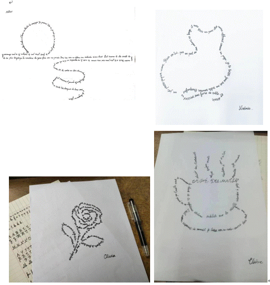 最后,Aude老师介绍了“图像诗歌”这一概念,即利用词语、诗行的排列来创造与内容大致相同的某种图案或形状的诗歌,并将其与书法相结合。展示了几幅图像诗示例后,她拿出事先准备的几张图案和对应的法语诗歌,供大家参考和选择,同时鼓励大家创作自己的图像诗。同学们的创意层出不穷,除了小猫、玫瑰花、音符等图案,还结合学习过的法语诗歌,画出了书本、日出等样式的图像诗,不仅图案栩栩如生,而且书写整齐美观,可见同学们的学习卓有成效。