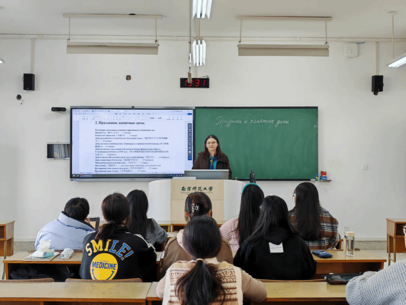 2023年11月23日,俄语教学专家尤利娅在南京师范大学学正楼为俄语系学生开设讲座。本次讲座的主题为“俄罗斯人的节庆传统”。讲座中尤利娅通过展示相关视频、图片,为同学们介绍了俄罗斯社会文化知识,并与学生积极互动。讲座取得圆满成功,学生收获颇丰。