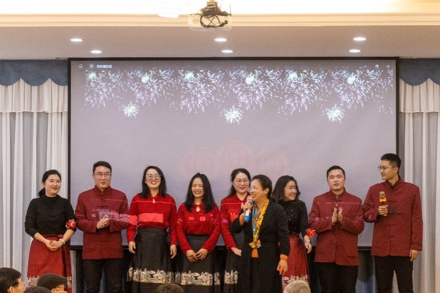 联欢会精彩呈现了由学工组、专外部、大外部、退休老同志精心编排的文艺节目,汇聚了小合唱、诗朗诵、歌曲串烧、戏剧选段等作品,展现了外院人朝气昂扬的精神风貌;孙书记和王院长借此机会,代表全院向2023年退休的几位教师献上鲜花和礼物,送上外院人的感激和致敬;学院党委和工会也将“院史知识竞答”环节融入精彩节目,让外院大家庭更加凝心聚力;最后,领导班子成员相继送上新年祝福,与全体教职工共绘外院大家庭美好蓝图,将联欢会推向高潮。