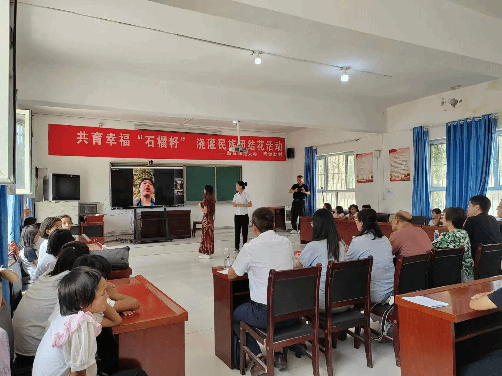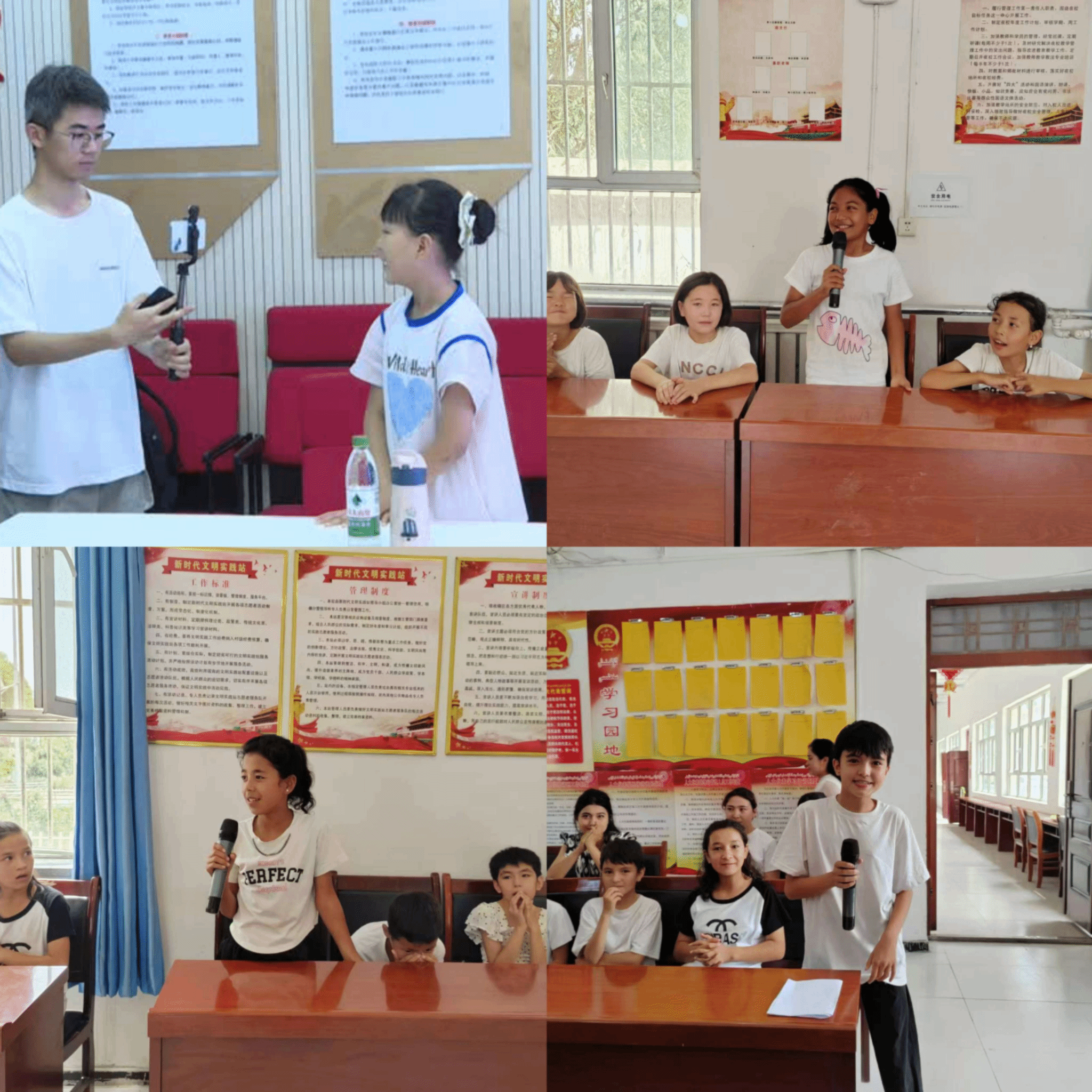 相关负责同志与疏勒县阿拉力乡和阿恰勒四村相关责任人和村里的40余名返乡大学生和少年儿童代表在现场参加交流,江苏省镇江市迎江路中心社区的20余大学生志愿者和社区少年儿童在线上参与了交流分享。