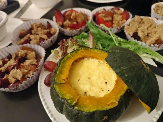 活动伊始,外教Tiana介绍了本次美食工坊的主题----法国传统甜点制作:奶酪南瓜舒芙蕾(Courgette soufflée au fromage)和烤李子酥(Crumble aux prunes)。接着在Tiana老师的细心讲解下,同学们首先制作了奶酪南瓜舒芙蕾。老师用法语介绍了每种食材的名称和用量以及制作步骤。从切开南瓜、去籽、打发蛋清,再到制作奶油、奶酪和面粉的馅料,大家一边动手操作,一边用法语与老师们交流。馅料调制完成后,同学们将其倒入焯熟的南瓜盅中,并加入适量盐、蒜粒、胡椒粒和普罗旺斯香料调味,最后放入烤箱。舒芙蕾出炉后,同学们搭配了一些沙拉、核桃仁和切半的葡萄装盘,迫不及待地品尝自己的劳动成果----口感绵软细腻,奶香四溢,大家纷纷赞叹:“C’est délicieux!”
