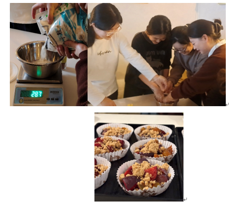 接着,大家开始制作另一道甜点——烤李子酥。同学们将新鲜的李子切块,撒上细糖,铺在模具底部;接着将肉桂粉、糖、盐和面粉混合均匀,慢慢加入切成小块的黄油,用指尖揉搓形成松散的酥粒,覆盖在李子块上。Tiana老师一边指导大家调整比例,一边教授法语中的烹饪用词,如“mélanger”“saupoudrer”“farine”等。二十分钟后,金黄酥脆的烤李子酥新鲜出炉,同学们品尝着这道法式甜点,感受其独特的口感和风味。