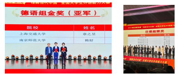 21级德英双语专业学生韩好、20级日英双语专业学生胡天宇代表南京师范大学分别在德语组和日语组赛道荣获全国总决赛金奖(亚军)和银奖。