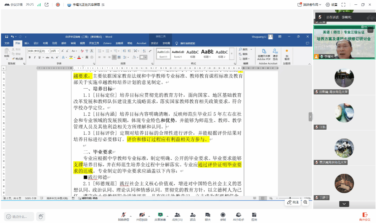 紧接着,英语教育系主任李曙光老师对师范认证的具体要求进行了详细解读,并就培养方案及课程大纲的修改提出了具体建议。李主任指出,师范认证的核心在于“一践行,三学会”,培养方案和课程大纲的修订必须围绕这一核心理念展开。他强调,培养方案应明确师范生的培养目标,突出师范专业特色,构建科学合理的课程体系,注重理论与实践相结合,培养学生的教育教学能力、学科素养和创新能力。在课程大纲的修订方面,李主任提出要以认证标准为导向,明确课程目标、教学内容、教学方法和考核方式,确保课程教学能够有效支撑培养目标的达成。他还结合具体案例,对课程大纲的格式、内容和撰写要点进行了详细说明,为教师们提供了清晰的修订思路和方法。