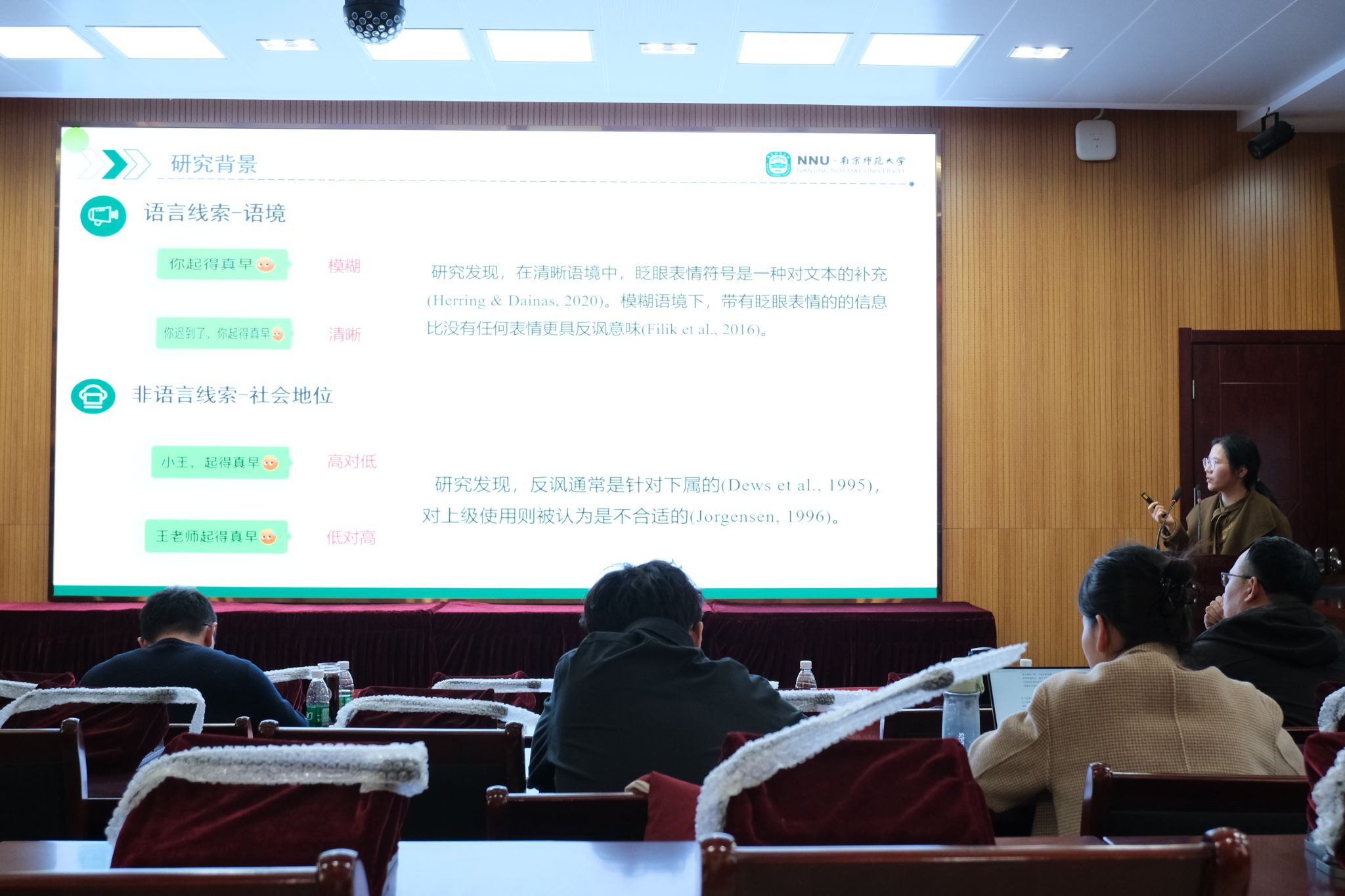 心理学院硕士研究生王健的“社会地位影响基于表情符号反讽理解的神经机制”研究,运用脑电和眼动实验,系统分析了社会地位对反讽加工的影响,发现清晰语境和模糊语境下社会地位对反讽和字面文本加工的影响存在差异。