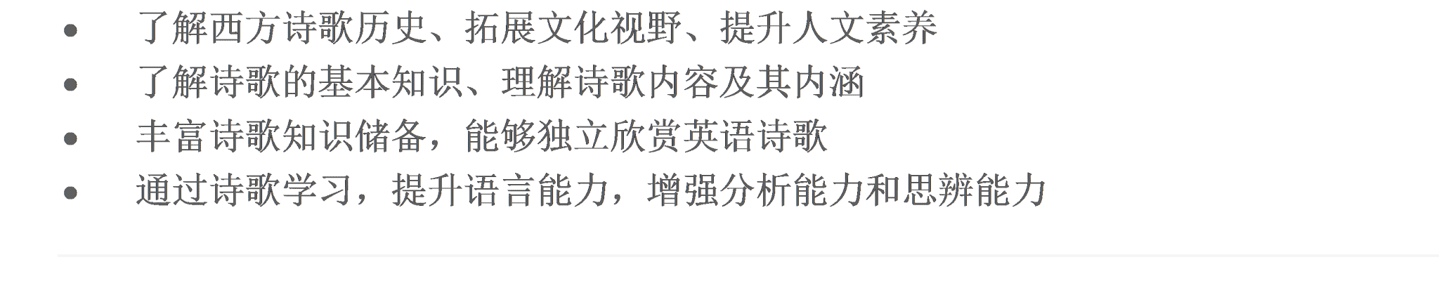 赏析结合,深入浅出 诗歌学习的难点在于理解简单诗行下所蕴含的丰富意义,如何理顺复杂句子结构的走向、如何把握文字以外的深刻寓意是诗歌教学的难点。课程在欣赏诗歌优美韵律的同时注重文本分析,深入挖掘诗歌内涵,揭示文字背后之深意,介绍诗歌产生的时代风貌。同时,课程对诗歌韵律、节奏、种类、风格进行介绍、分析,化难为易、深入浅出,为不同层次的学习者铺平诗歌学习之路。