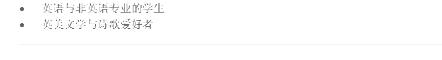 难易适度, 受众面广 课程在选材与教学方面考虑不同层次的学习者的水平,因而课程既可以作为英美诗歌入门的博雅课,也可以作为英语专业的文学选修课;既可以拓展英国文学知识,又可以作为英语语言水平提高课程。课程视频配有字幕,为不同英语水平的学习者提供了便利。