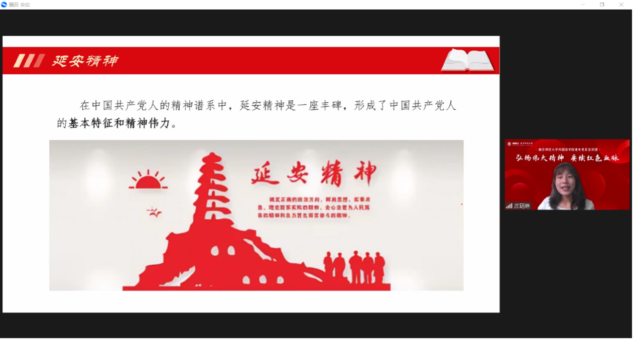 庄玥琳同学以1936年美国记者埃德加·斯诺到延安采访的视频为引,层层推进地向大家介绍了延安精神的深刻内涵、本质和核心,并为大家讲述了宣讲团精品课程《回望延安岁月》。