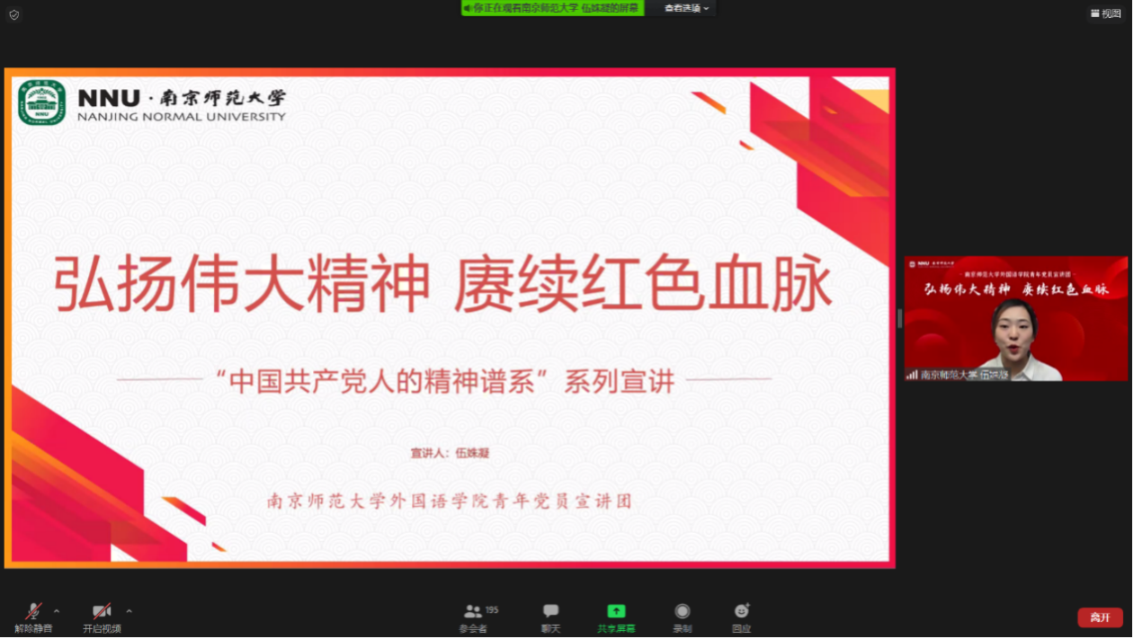 “弘扬伟大精神 赓续红色血脉”青年党员“精神谱系”宣讲团,与西交利物浦大学两百余名同学以线上会议的形式见面,就“百年党史”学习进行了交流与探讨。宣讲团队长潘可文同学作开场词。