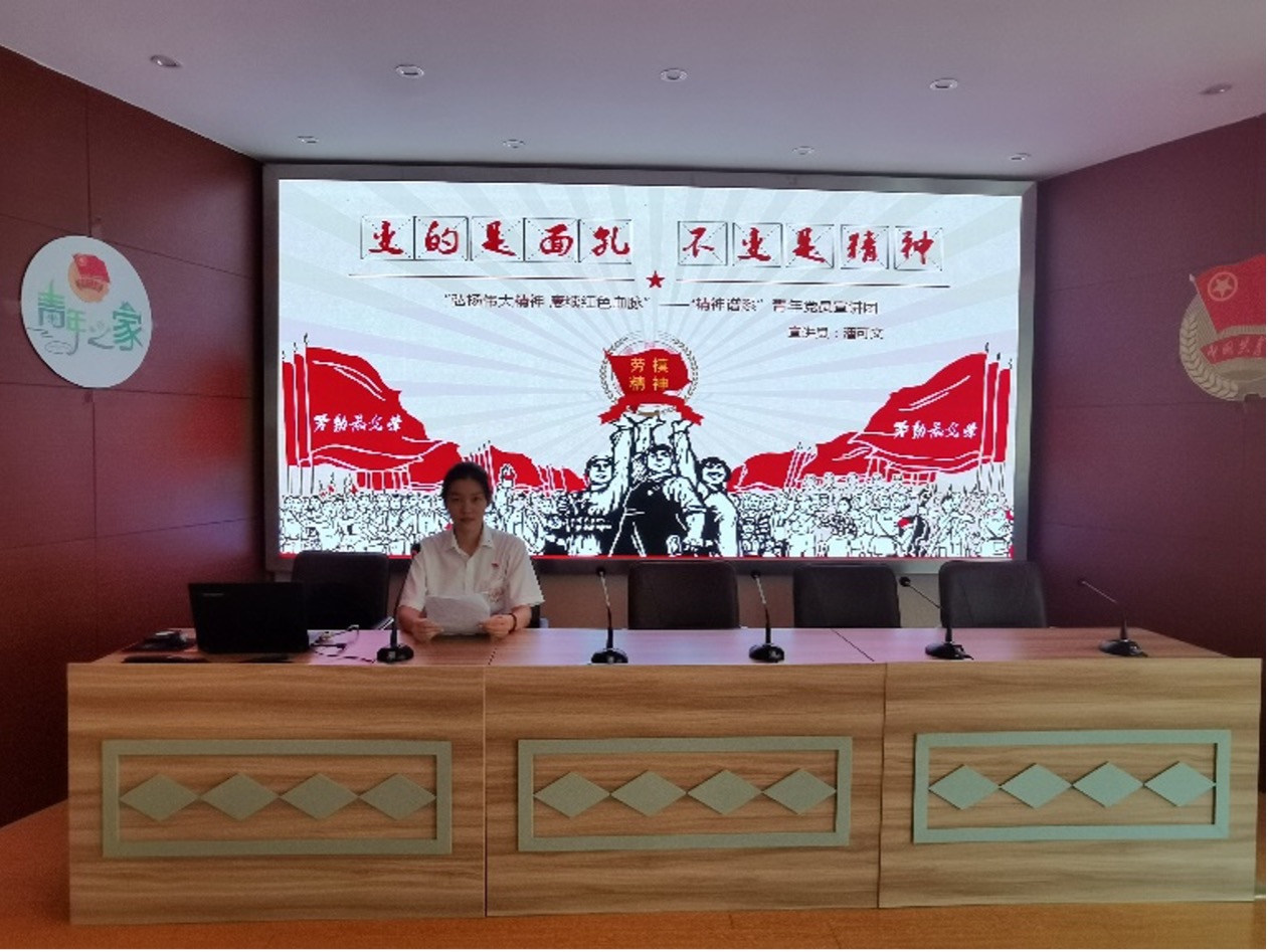 接下来,青年党员宣讲团的潘可文同学以“变的是面孔,不变的是精神”为主题,进行了劳模精神的专题宣讲。宣讲员根据不同时期,分析劳模精神不断升级的根本原因,讴歌工人阶级永远保持冲劲、韧劲、实劲的伟大品格。最后,以习近平总书记的话作结,发出强有力的号召。
