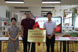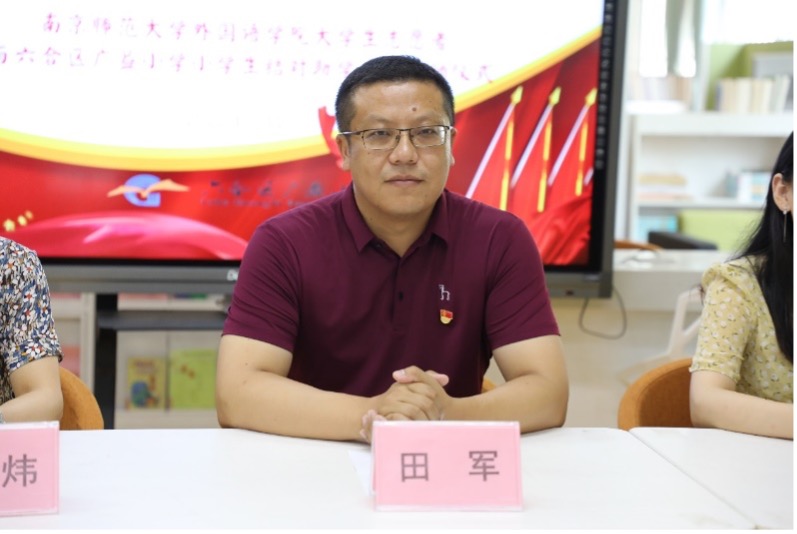 团委书记张碧莹与六合区广益小学校长郑雪峰共同签署了结对共建协议,田军、卢炜和郑雪峰共同为志愿服务基地揭牌。