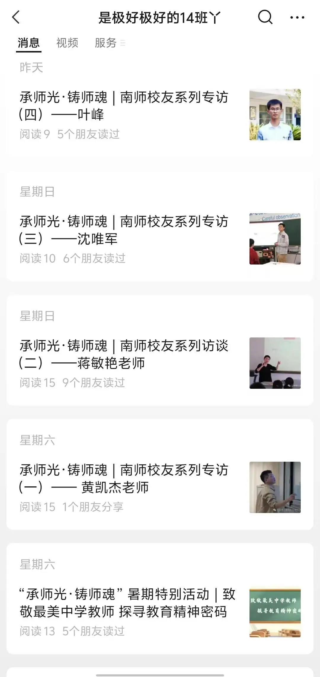 师言辑录,共赏校友风采通过精心策划与细致访谈,我们成功收集了多位杰出中学教师校友的教学育人心得与教育精神阐释,并将其精心整理成《承师光·筑师魂——最美教师访谈录》,并在本班微信公众号上进行系列推文。访谈录中不仅展现了教师们无私奉献的精神风貌,还传递了他们对教育的热爱与执着,便于让广大校友共赏教育风采,激发社会各界对教育的关注与尊重。