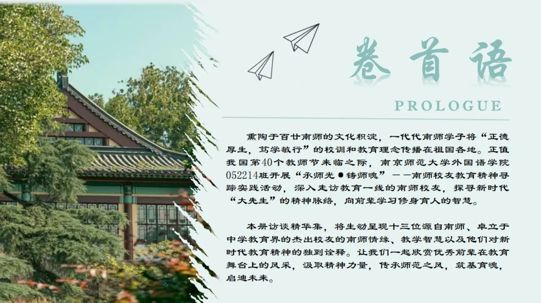 2022级英语师范专业052214Z班全体成员响应学校号召,组建了“承师光·铸师魂”暑期社会实践团队,开展了一场别开生面的“寻访最美教师”活动,旨在深入了解南师优秀中学教师校友的教学实践、教育理念以及对教育精神的深刻理解。本次活动中,实践队员深切感受到了教育家精神的魅力,加深了作为师范后生对教师职业的认识,坚定了投身教育事业的决心。