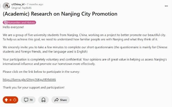 团队分为调研组、摄制组和美工组。7月中旬,调研组的成员撰写调查问卷,在国外社交平台Facebook和X投放,但效果不够理想。于是,小组成员进一步了解国外用户社交媒体使用习惯,及时调整策略,在X做文化知识分享,在Reddit做“长线”调研,收集到百余份有效答卷,为撰写调研报告打下坚实基础。同时,成员更加了解国外社交平台的规则,深刻体会到国内外网络环境的差异,对探索中国的特色城市逐渐走出国门被世界接受的宣传路径有了更深入的思考。
